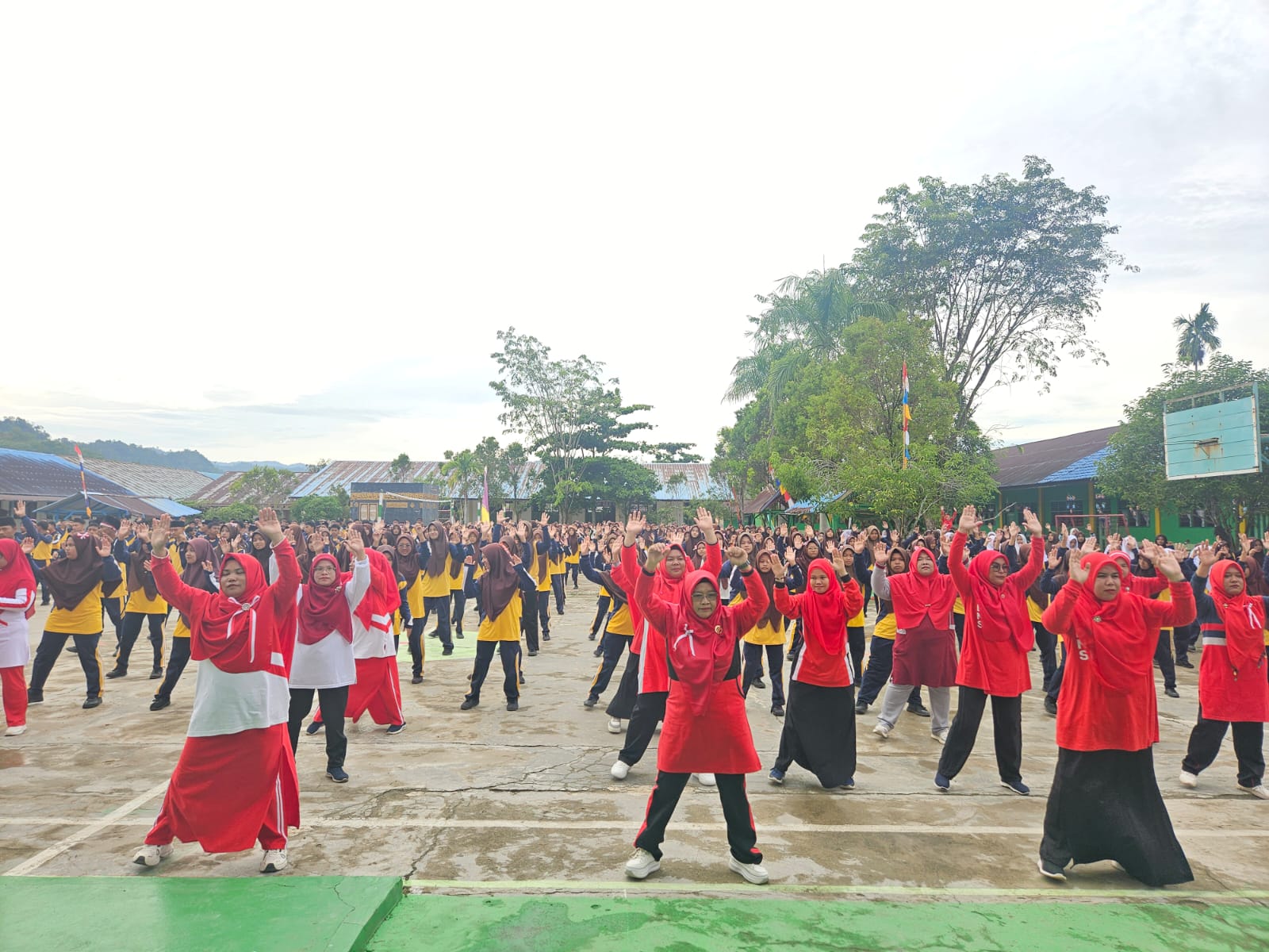 Instruktur senam memandu gerakan dengan penuh energi, diiringi musik yang riang dan membangkitkan semangat. Peserta mengikuti setiap gerakan dengan ceria, sesekali mengeluarkan yel-yel kemerdekaan yang menggema di seluruh halaman madrasah.