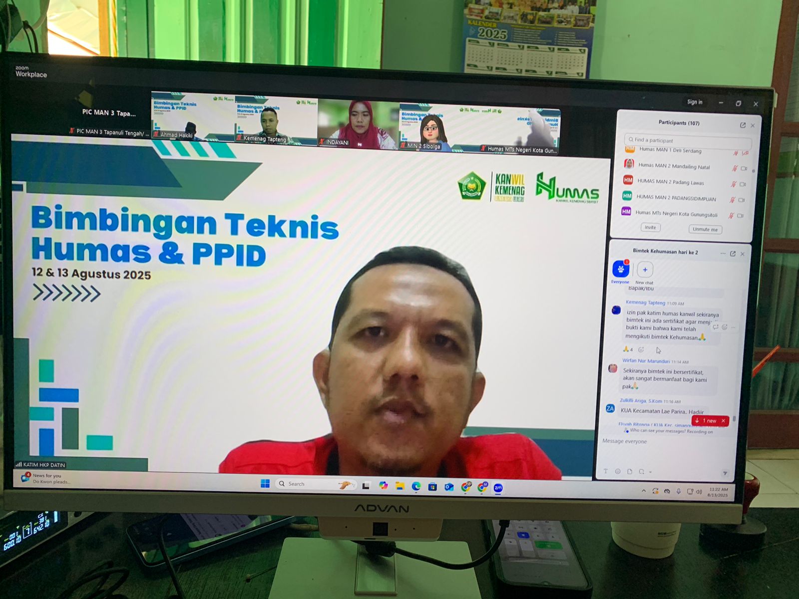 Pandan (Humas). Wakil Kepala Bidang Humas Asradewita & PIC MAN 3 Tapanuli Tengah Monika Sari Siregar mengikuti Bimtek Humas & Tata Kelola PPID yang diselenggarakan oleh Kantor Wilayah Kementerian Agama Provinsi Sumatera Utara yang dilaksanakan secara zoom meeting pada hari Selasa, 12 Agustus s/d Rabu 13 Agustus 2025 bertempat di MAN 3 Tapanuli Tengah. Bimtek tersebut dibuka secara langsung oleh Kepala Kantor Wilayah Kementerian Agama Provinsi Sumatera Utara H.Ahmad Qosbi, S.Ag MM.