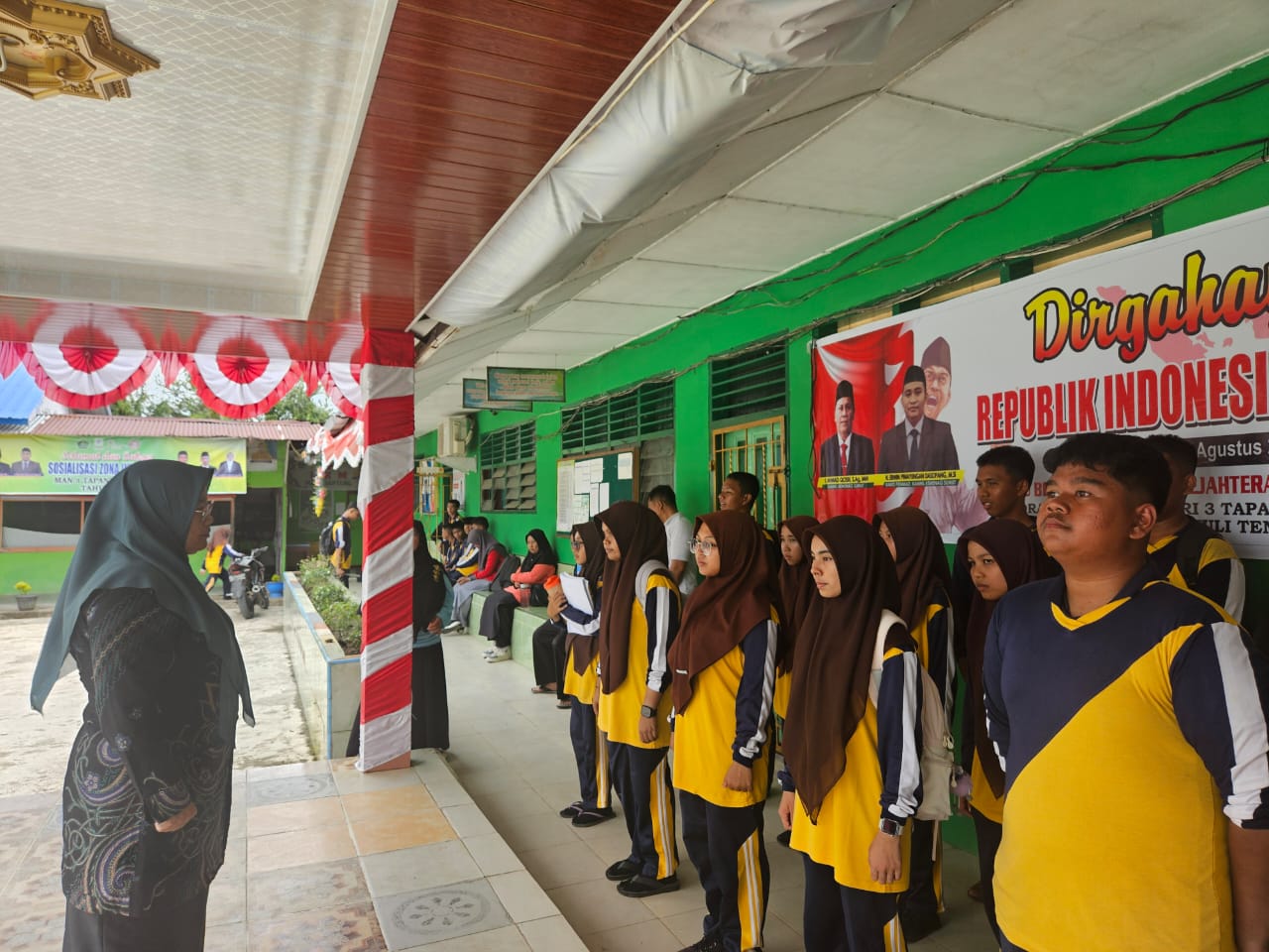 Pandan(Humas). Menjelang pelaksanaan Olimpiade Madrasah Indonesia (OMI), Kepala MAN 3 Tapanuli Tengah, Hj. Juraida Siregar, S.Ag., M.Pd., memberikan arahan sekaligus pembinaan khusus kepada peserta didik yang akan mengikuti ajang bergengsi tersebut pada Sabtu, 30 Agustus 2025. Kegiatan ini berlangsung di Halaman Madrasah dan diikuti dengan penuh antusias oleh para peserta didik, guru pembimbing, serta jajaran tenaga pendidik, Sabtu(30/8).
