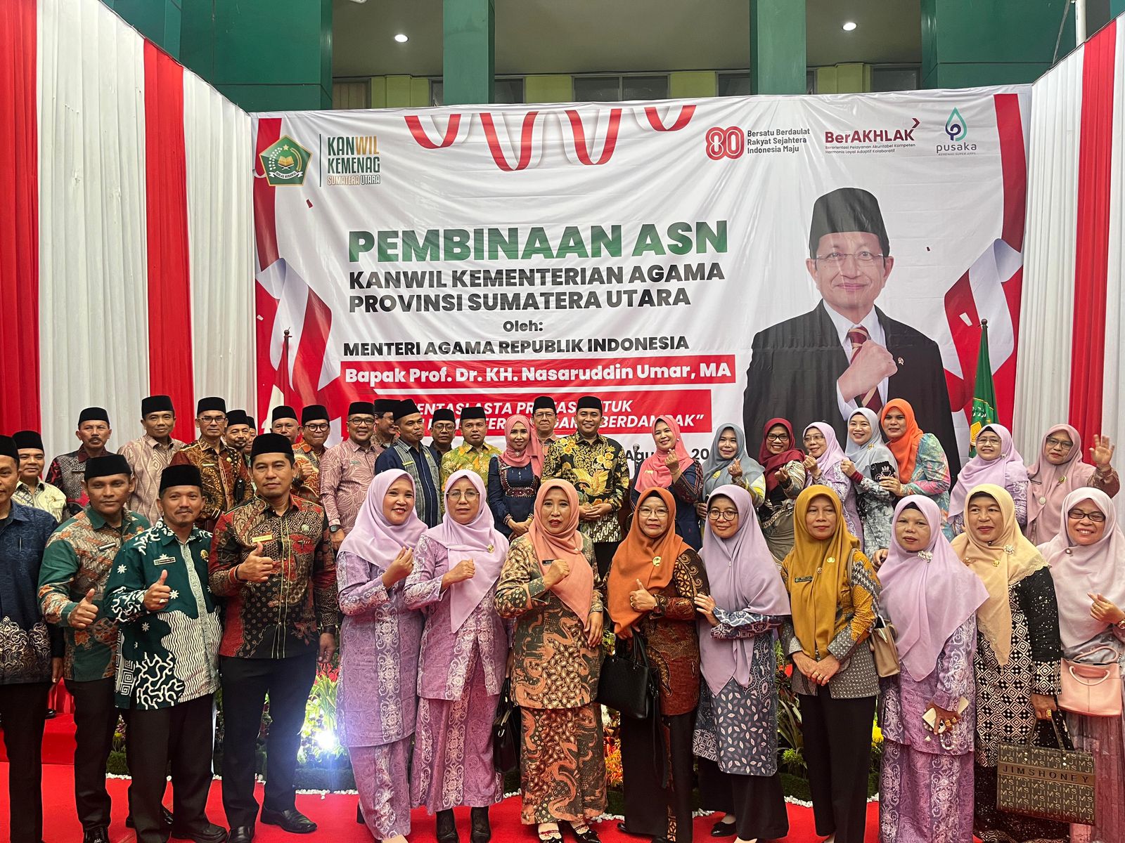 Medan (Humas). Menteri Agama RI Prof. Nasaruddin Umar mengingatkan Aparatur Sipil Negara (ASN) untuk bersinergi mewujudkan Asta Cita Program Prioritas Kementerian Agama, hal ini disampaikan Menag saat memberikan motivasi pembinaan bagi ASN di Kantor Wilayah Kementerian Agama Provinsi Sumatera Utara pada Rabu (20/08).